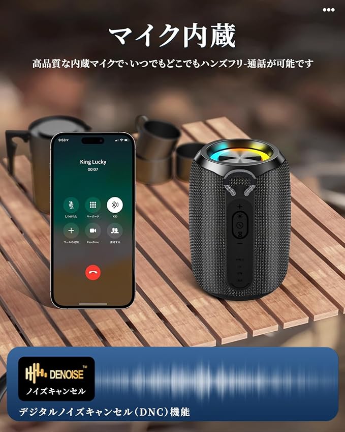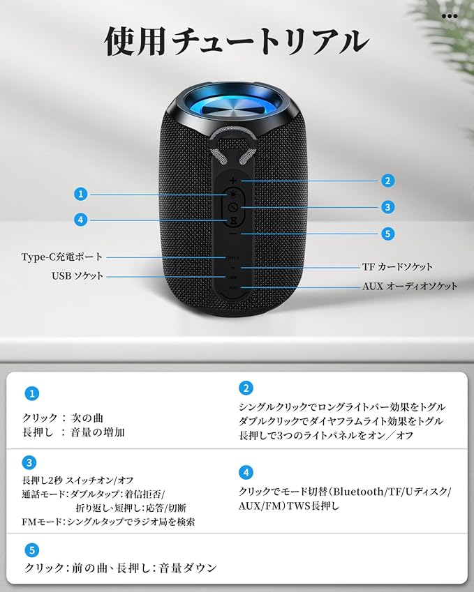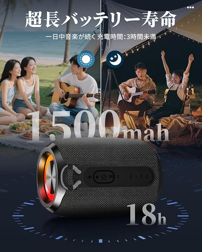 【Type C充電式&RGB LEDライト搭載】ブルートゥース スピーカーはType C充電式なので、モバイルバッテリーやパソコンなどのUSBデバイスで簡単に充電できます。Bluetooth スピーカーは1500mAhの大容量バッテリーと先端の省電力技術を採用しており、1回のフル充電で最大18時間の音楽再生が可能です。このワイアレススピーカーはマルチカラーLEDライトを搭載し、いろんな色が変化し、ライトショーをあなたに差し上げます。スピーカー機能を利用しない場合、夜のテーマライトにしても全く問題ありません。休日、お祝いの日に、友達とパーディーを開く場合、ぜひこのスピーカーをONしてください。音楽を流させ、音楽のリズムが弾むとともにライトが変化し、あなたのパーティーを盛り上げます。