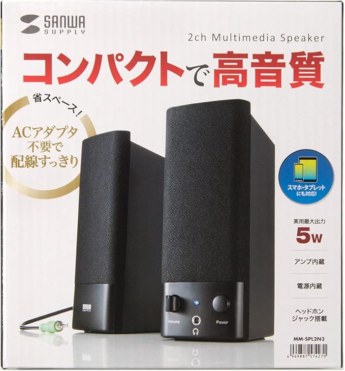 ●アンプ内蔵でヘッドホンステレオの出力端子やパソコンの音声端子につなぐだけで音楽を楽しめます。●実用最大出力5W(2.5W+2.5W)で小型ながらパワフルなサウンドを楽しめます。●深夜や周りに気を使う環境にも便利なヘッドホン端子を内蔵しています。●電源内蔵なのでコンセント周りをすっきりと配線できます。■カラー:ブラック■実用最大出力:5W(2.5W+2.5W)■周波数特性:200~20000Hz■スピーカー形式:バスレフ型フルレンジスピーカーシステム■スピーカーサイズ:2 3.5インチ(直径50 88mm)■ロードインピーダンス:4Ω■入力端子:ステレオミニプラグ(3.5mm)■電源:内蔵■外部出力:ヘッドホン端子■サイズ:W60 D66 H150mm■重量:474g■ケーブル長:パソコン接続ケーブル/約1.2m、スピーカー間ケーブル/約1.0m、電源コード長/約1.2m■セット内容:本体、取扱説明書