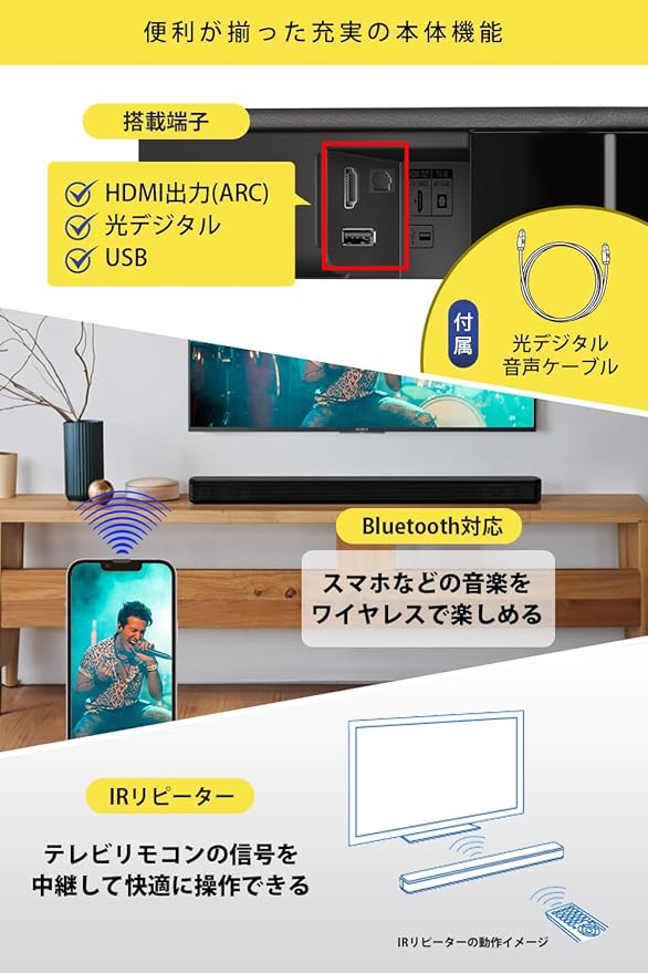 手軽に置いて、テレビの音をグレードアップ。HDMI端子を搭載したテレビスピーカー2ウェイスピーカーシステムによ人の声がすっきりクリアに聞こえる高精細なサウンドを実現人の声やセリフをアップし、聞き取りやすくする「ボイスモード」や深夜の小音量時でも明瞭感のあるサウンドを実現する「ナイトモード」、スタンバイ時の消費電力を低減する省電力機能「オートスタンバイ」も搭載さらにBluetooth対応機器の音楽をワイヤレスで楽しめます