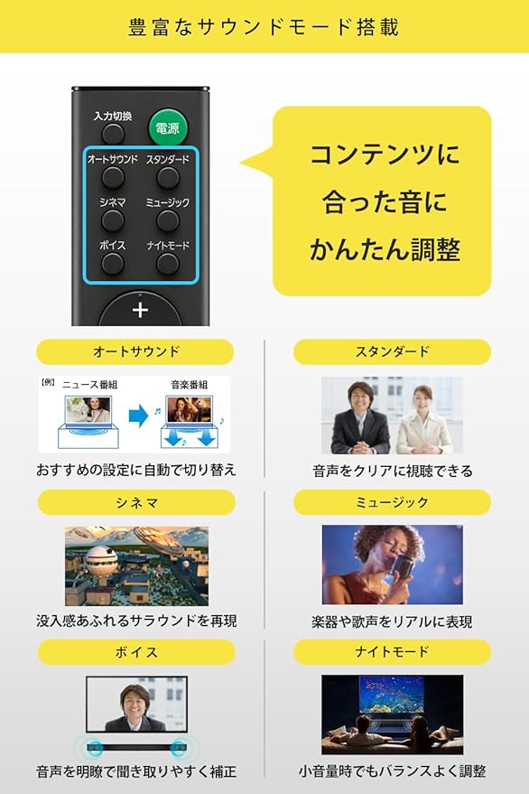 【豊富なサウンドモード】▼楽器や歌声をリアルに表現する「ミュージック」モード▼深夜の小音量時も使える「ナイトモード」▼音声を明瞭で聞きやすく補正する「ボイス」モード