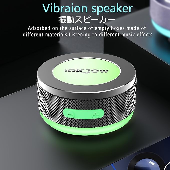 骨伝導スピーカーと振動スピーカーのデュアル機能: このポータブルワイヤレススピーカーは、骨伝導技術と振動スピーカーを組み合わせており、さまざまな素材の表面に吸着させて使用できます。壁やガラス、木材などに貼り付けることで、素材ごとに異なる音楽効果を楽しむことができます。