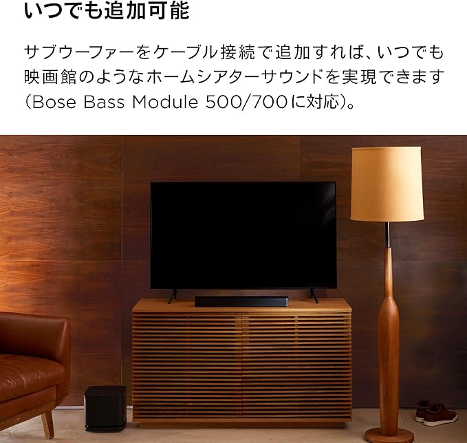 システム拡張が可能 — Bose TV SpeakerはBose Bass Module 500/700に対応。接続には別売りのBose Bass Module Connection Cableまたは標準3.5 mmオーディオケーブルが必要です。