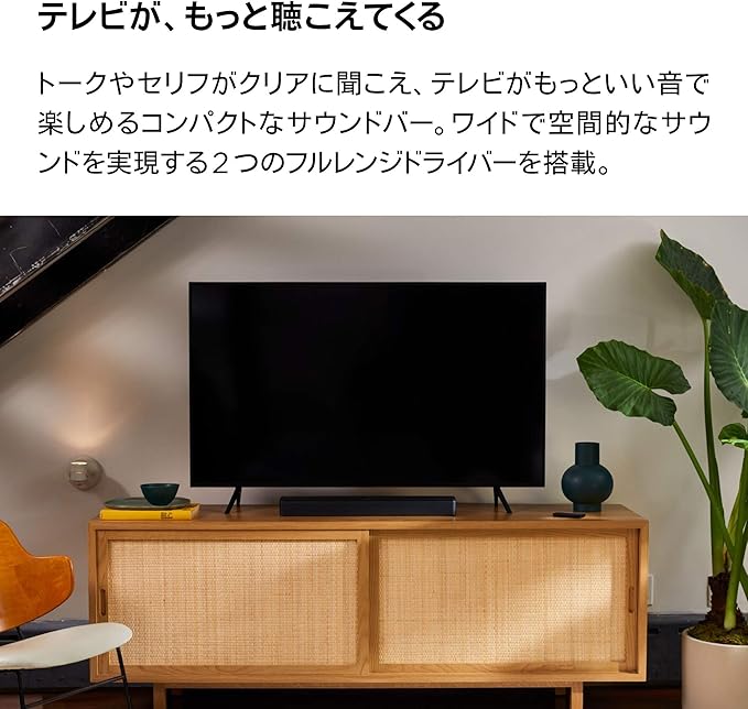 Bose TV Speakerで、テレビのサウンドを、もっとクリアに。トークやセリフをクリアに再生、テレビのサウンドを向上させるコンパクトなサウンドバーです。内部には、角度のついた2つのフルレンジドライバーを搭載し、拡がりのあるサウンドを実現。さらに中央のツイーターがボーカルを際立たせます。ドルビーデコード内蔵で、スピーカーのオーディオ機能を強化、よりリアルで豊かなリスニング体験を実現。
