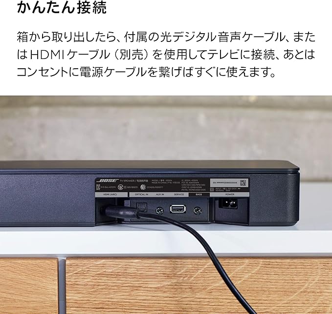 簡単セットアップ — テレビとサウンドバーは、光デジタルケーブル(付属)またはHDMIケーブル(別売り)を1本接続するだけ。わずか数分でセットアップできます。