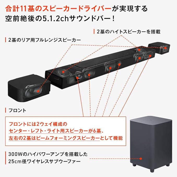 Dolby Atmosと独自のMultiBeamを組み合わせ、11基のスピーカーで創る5.1.2chの立体音響空間を再現。