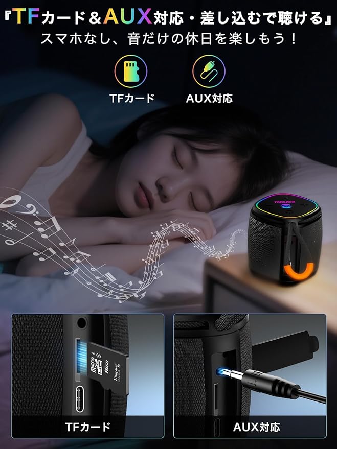 【TFカード&AUX対応・差し込むで聴ける】TFカードを差し込めば、音楽を楽しめます。さらにAUX接続対応で、幅広い機器と簡単につながります。外出先でも家でも、すぐ音楽を楽しめる使いやすさが魅力です。