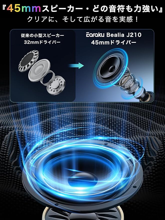 【45mmスピーカー・どの音符も力強い】45mmの大口径スピーカーは、一つ一つの音符を豊かに表現します。小型スピーカーですが、音楽の魅力を力強く伝えます。