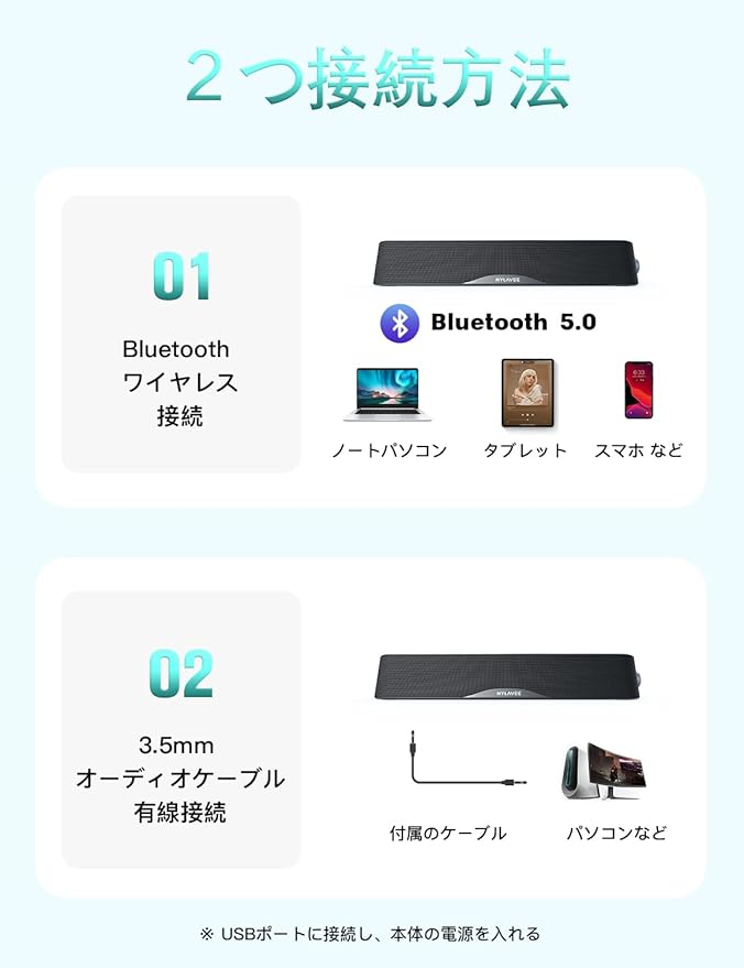 【2つの接続方法】 Nylavee PCスピーカーには、Bluetooth と3.5mmオーディオケーブルの2つ接続方法があります。ノートパソコン、デスクトップ、PC、携帯電話、タブレット、PS4など幅広いデバイスと互換性があります。
