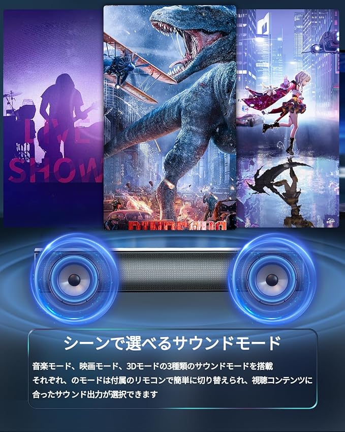 【3つのサウンドモード 臨場感あふれるサウンド】 シーンに合わせてカスタマイズ可能な3つのサウンドモード。映画モードでは迫力の重低音、音モードではクリアな音質、3Dモードでは明瞭な会話が楽しめます。付属のリモコンで簡単に切り替え可能で、臨場感あふれるサラウンドサウンドをお好みに合わせてお楽しみいただけます。DSPテクノロジーにより、卓越したクリアでリアルな音質が提供され、音楽や映画を楽しむたびに、まるでその場にいるかのような感覚を体験できます。音楽の微細なニュアンスまで美しく再現し、臨場感あふれるエンターテインメント体験をお届けします。