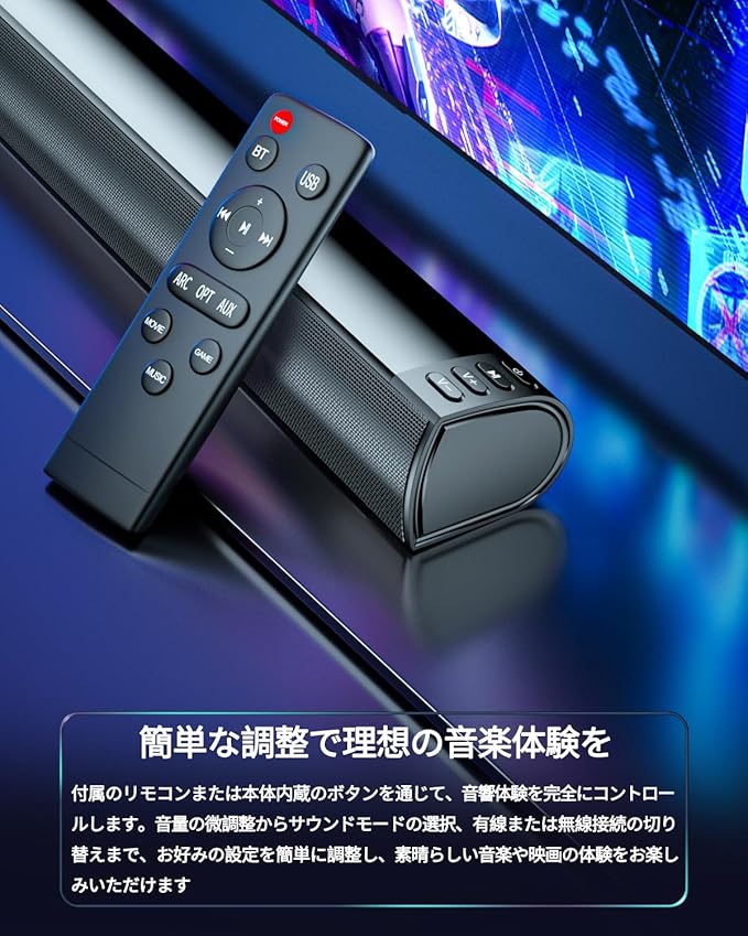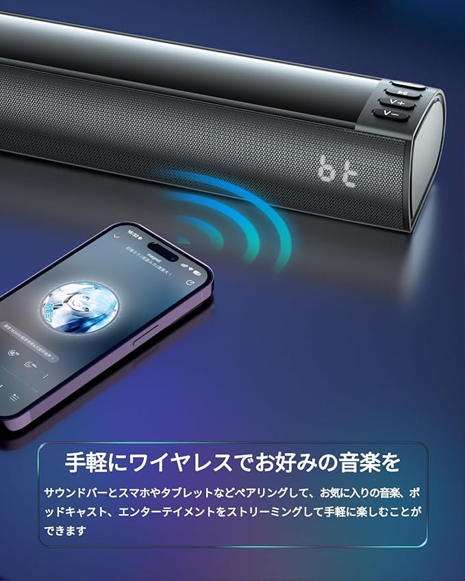 【一本のケーブルで魔法の音楽体験 ARCサウンドバー】 ARCに対応したサウンドバー。ARC対応のテレビとHDMIケーブル1本で電源のON OFFを連動し、すっきりとした配線でスタイリッシュな設置が可能。手軽に豊かなサウンドを楽しむことができ、有線接続に 加えてBluetoothでサウンドバーとスマホやタプレットなどペアリングして、お気に入りの音楽、ポッドキャスト、エンターテイメントをストリーミングして手軽に楽しむことができます。(使用前に、テレビの音声外部出力設定のPCMに設定してください。)