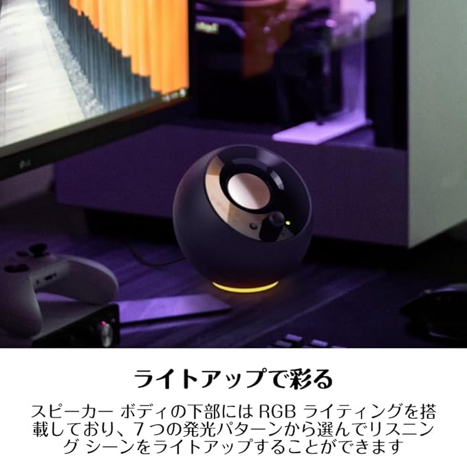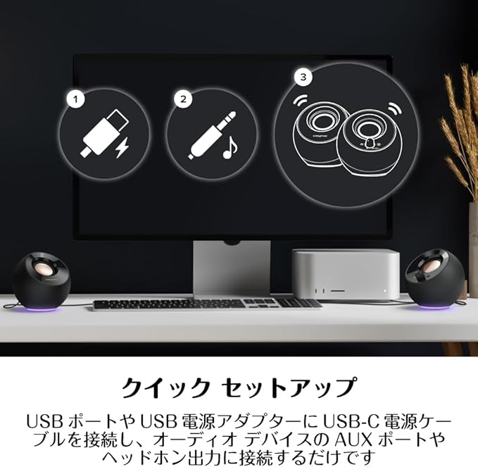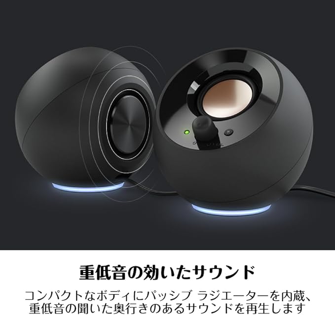 【ケーブル2本接続タイプ:USBから電源 & アナログケーブルで音声を入力】人気のUSB電源スピーカー「Creative Pebble」と同様に、パーソナル リスニングに適したサウンド ステージを実現するアナログ接続タイプのアクティブ スピーカー。スピーカー ボディ下部にはRGB ライティングを搭載しており、7つの発光パターンでデスクトップをライトアップすることが可能、ムードや好みに合わせてライティング パターンを選択可能