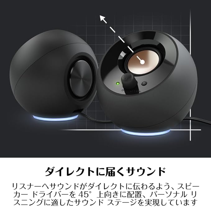 球形状のサテライト スピーカーは、リスナーへサウンドがダイレクトに伝わるよう、スピーカー ドライバーを45 の上向きに配置