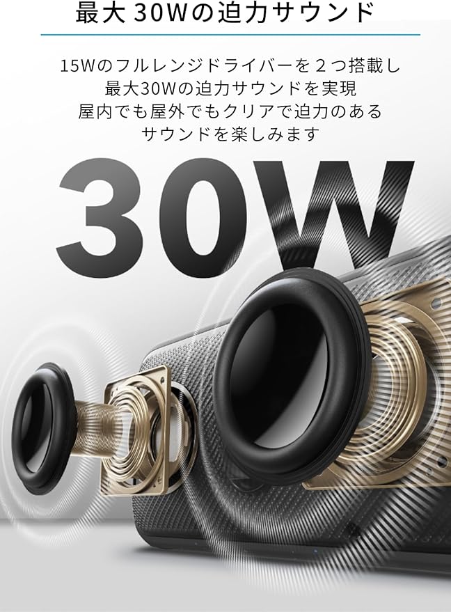 最大30Wの迫力サウンド:15Wのフルレンジドライバーを2つ搭載し、最大30Wの迫力サウンドを実現。屋内でも屋外でもクリアで迫力のあるサウンドを楽しめます。