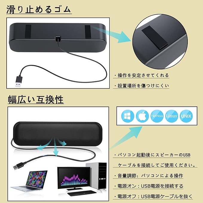 4.「幅広い互換性」さまざまなドライバーをダウンロードする必要はありません。Windows、Net Ware、Unix、Linux、Macなどと連続して使用することができます。usbスピーカーは黒を基調としたシンプルなデザインなので、インテリアとマッチしやすいのも魅力です。連続のケーブルは約120cmで自由な配置できます。