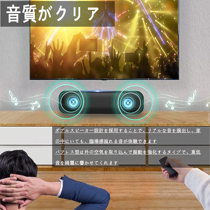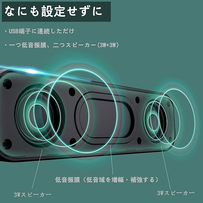 2.「大音量スピーカー」このpc小型スピーカー実用最大出力は6W(3W+3W)です。(一つ低音振膜、二つスピーカー)音声信号をデジタルで伝送するので、音質劣化の原因となるノイズの混入を防ぎます。入力した音源を独自にデジタル処理しているので、明瞭感が高いです。小さな音量でも自然に聞こえるように音響バランスを自動で調整してくれます。中・高音域の再生力も優れており、音潰れが少ないと言えます。ダブルスピーカー設計を採用することで、リアルな音を演出し、家の中にいても、臨場感溢れる音が体験できます。バフレス型は外の空気を取り込んで振動を強化するタイプで、重低音を綺麗に響かせてくれます。会議やノートパソコン用最適です。