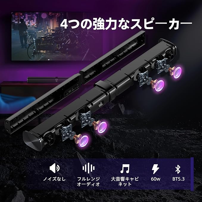 臨場感あふれるサラウンドサウンド:当社のサウンドバーを使うことで、音響体験が向上し、4つの高性能ドライバーを搭載し、映画館のようなサラウンドサウンドを提供します。各シーンやサウンドトラックが生き生きと再現されます。
