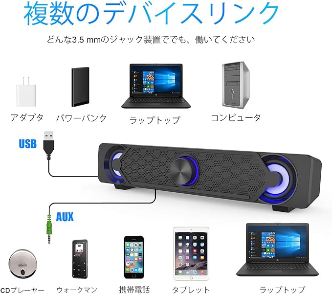 ♪『簡単な操作』:USBケーブルを電源に接続し、3.5mmオーディオケーブルをデバイス(PC /ノートブック/スマートフォンなど)のオーディオ出力に挿入します。次に、スイッチを回してサウンドバーをオンにします。回転ボタンを回して音量を調節します。サウンドバースピーカーの音量を簡単にコントロールできます。