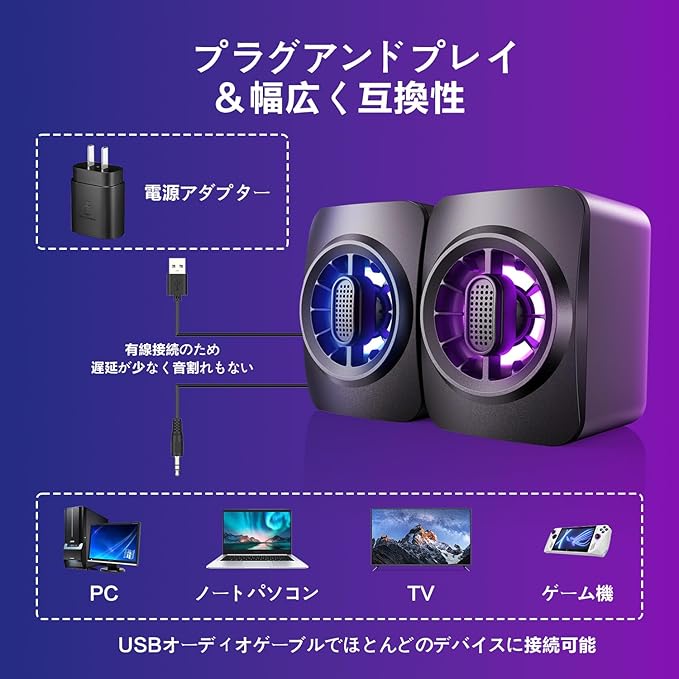 【接続簡単&プラグアンドプレイ】汎用性の高い3.5mmミニオーディオジャックがパソコンだけではなく、ほとんどのデバイスに対応できます。有線接続のため遅延が少なくて音割れもしません。省電力のUSB電源タイプとして、パソコンのUSBポートに接続することで、手軽にお楽しみいただけます。 注意事項:電源を供給する機器によっては、ノイズが大きく聞こえる場合があります。ノイズが気になる場合は、他のPCやUSB充電器など別の機器から電源供給をしてください。
