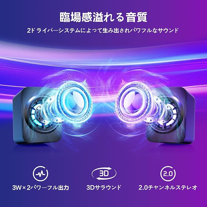 【RGBダイナミック照明効果】素敵なカラフルな呼吸サイクルRGBライトを備えており、ゲームをしたり、映画を見たり、音楽を聴いたりする時に雰囲気を高めます。スピーカー本体はクラシックでミステリアスなブラックトーンを採用し、RGBライトで飾られ、全体の形はとてもクールで、PCゲームに最適です。