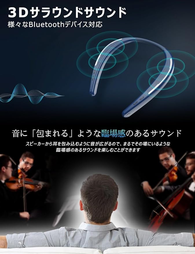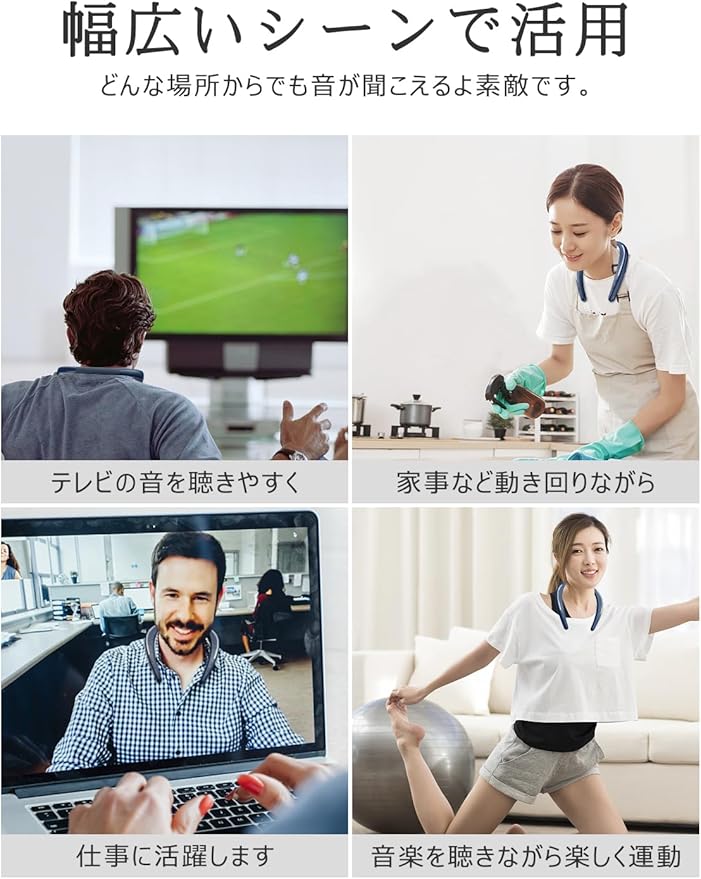 【幅広いシーンで活用】スピ一カ一と耳の位置が近くて耳元でクリアで音声が聞けます。小さい音量でも迫力たっぷりのサウンドを楽しめます。ネックスピーカーは集合住宅等で騒音になってしまう心配がある等では活躍するかもしれません。家事をしながらテレビを楽しんだり、深夜でも音量を気にせずにテレビ鑑賞が楽しめます。屋外でウェアラブルネックスピーカーを使用する場合、犬の散歩やサイクリングなど、使用中でも周囲の音が聴こえるので安全性があります。(※ご注意:多少の音漏れはしますが、気になるならよくご検討ください。)