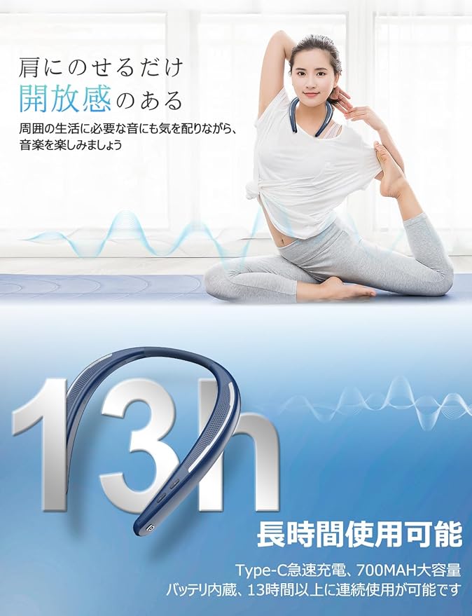 モデル名 首にかけるだけで耳をふさがずにリスニングが楽む!ネックスピーカーの魅力です。聴き疲れや耳への圧迫感がありません。ハンズフリー、イヤーフリー、スポーツフリーを実現します。忘れるような軽量(88g)だけで人間工学に基づいて作られた首・肩・鎖骨の3点で支えられて心地よい装着感で一日中装着しても疲れることはないです。首にかけるだけで耳をふさがずにリスニングが楽む!ネックスピーカーの魅力です。聴き疲… 表示を増やす