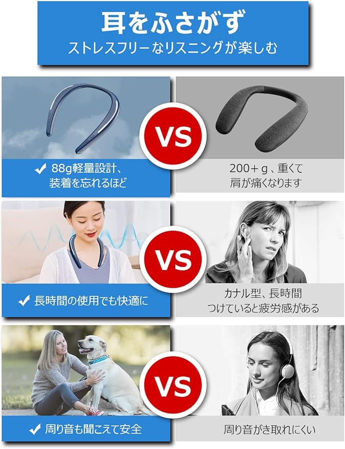 【首掛け&超軽量&快適な装着感】首にかけるだけで耳をふさがずにリスニングが楽む!ネックスピーカーの魅力です。聴き疲れや耳への圧迫感がありません。ハンズフリー、イヤーフリー、スポーツフリーを実現します。忘れるような軽量(88g)だけで人間工学に基づいて作られた首・肩・鎖骨の3点で支えられて心地よい装着感で一日中装着しても疲れることはないです。