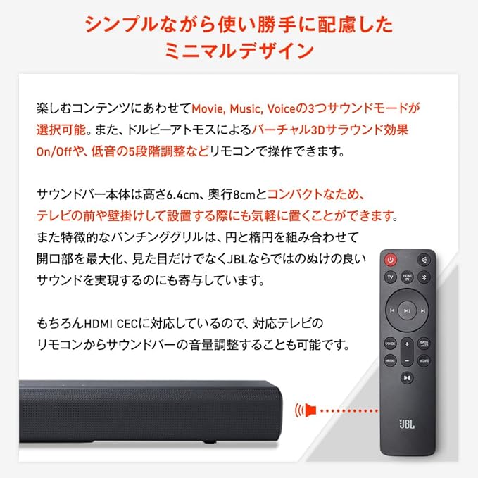 楽しむコンテンツに合わせて「Movie」「Music」「Voice」の3つのサウンドモードが選択可能。Dolby Atmosによるバーチャル3Dサラウンド効果のオン/オフや、低温の5段階調整など、時間帯に合わせて調節も可能。