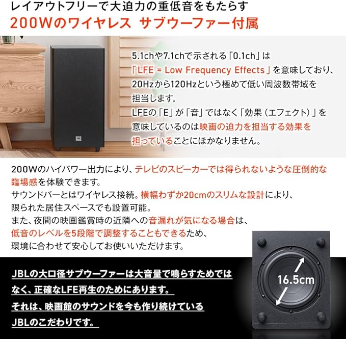 限られた居住スペースでも重低音専用の横幅わずか20cmのスリムなサブウーファーで、映画作品に収められた音をテレビのスピーカーでは得られないような圧倒的な臨場感を体感できる。サウンドバーとの接続はワイヤレス接続のため、サウンドバーとの距離を気にせずに設置が可能。
