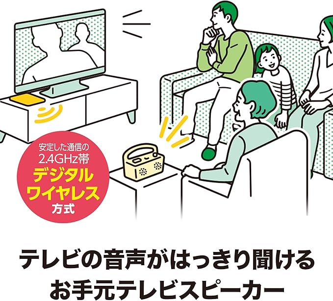 「しっかり聴ける、を日常に」をコンセプトに、暮らしの中で音の悩みを解決する SOUND ASSIST(サウンドアシスト)シリーズ のお手元スピーカー。 テレビの音が聴き取りにくいときや大きな音を出しにくいときに、あなただけ“はっきり”とテレビの音を聴くことができます。 ワイヤレスでお部屋の中を自由に持ち歩くことができますので、電波の届く範囲であれば、リビングやキッチンなどお好きな場所でテレビの音をお楽しみいただけます。