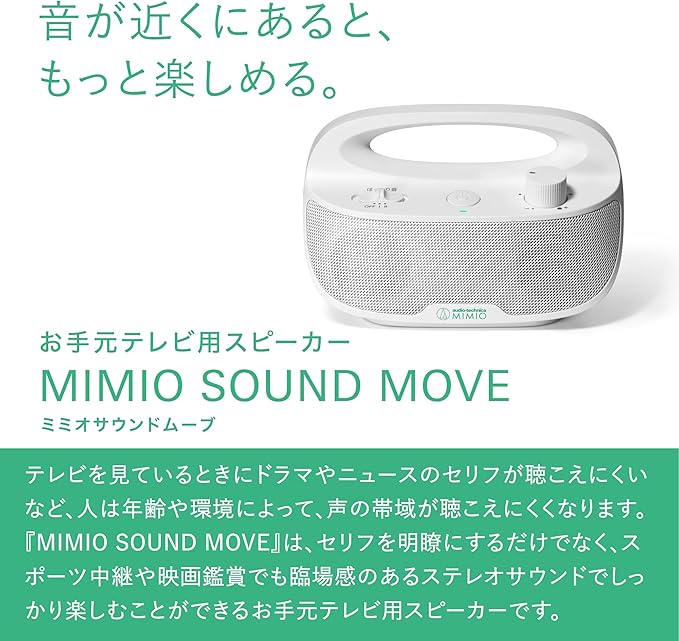 オーディオテクニカミミオ MIMIO SOUND MOVE お手元テレビ用スピーカー 2.4GHz ワイヤレス はっきり音 ステレオ かんたん操作 置くだけ充電 自動電源オフ機能 防滴 拭き取りクロス付き ATMM-SP780TVWH(E) ホワイト