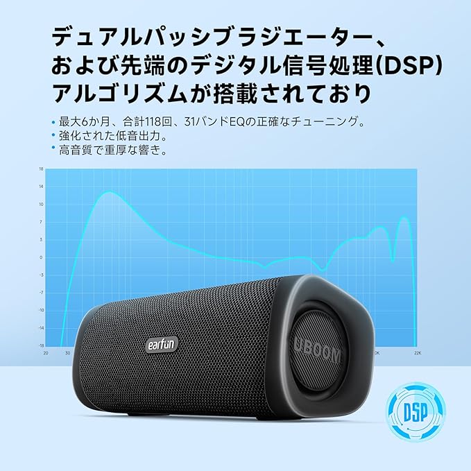 【16時間連続再生】EarFun UBOOM Lは2600mAhの大容量バッテリーを搭載し、1回のフル充電で最大16時間連続再生が可能です。一日中音楽の世界に浸ることができます。【持ち運びに便利】コンパクト なデザインで吊り下げストラップがあるので、どこにでも気軽に持ち運べます。お好きな場所で音楽を楽しみましょう。注意:稼働時間、充電時間は、ご使用環境、音量、音源などの条件により影響を受けます。予めご了承くだだい。
