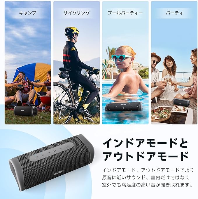 【2種類のサウンド効果】「インドアモード」低音を増強することにより胸に響く迫力のサウンドを体感できます。「アウトドアモード」より明瞭な大音量サウンドが出ます。広 い空間や屋外での音楽再生にオススメで す。注意:このスピーカーにはサラウンドモードはありませんので、既存の屋内/屋外モードに正しく切り替えてください。【ハンズフリー通話対応】高感度なコンデン サー型マイクが内蔵されており、ハンズフリー通話はもちろん、SiriやGoogle Nowなどの音声アシスト機能にも対応できます。料理中、作業中、入浴中など、電話が手元に無い時や手が離せない環境で便 利に使えます。