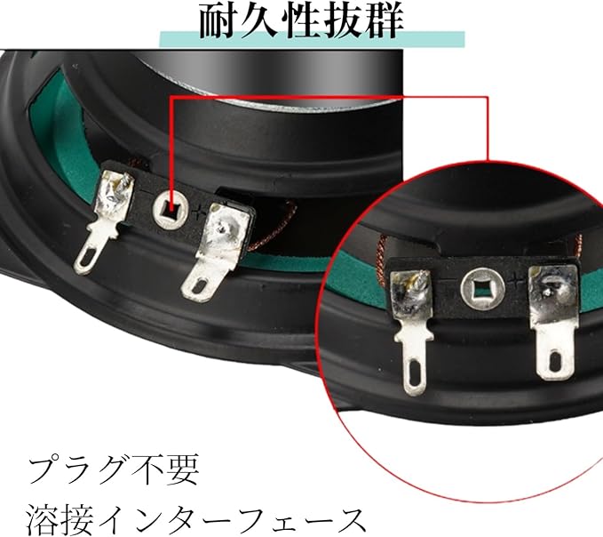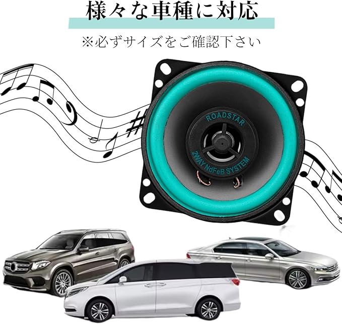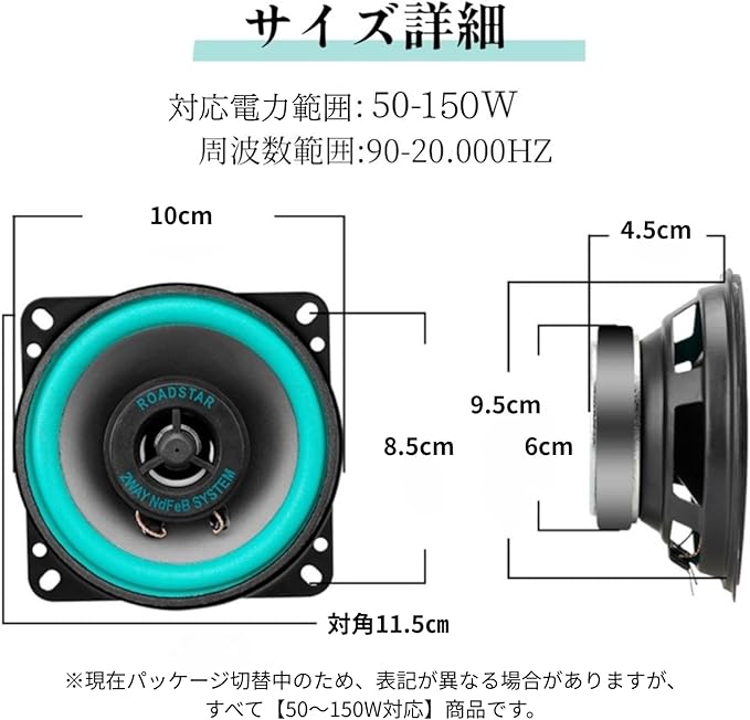 【商品詳細】内容:車用スピーカー2個 音声感度:90dB、インピーダンス:4Ω、周波数範囲 (Hz):90Hz-20000Hz、出力:50W-150W、電圧:12v-24v ※本製品は現在、旧パッケージ(50~100W表記)と新パッケージ(50~150W表記)の商品が混在しておりますが、いずれの商品もメーカー確認済みで、実際には50~150Wまで安全にご使用いただけます。 パッケージ表記に関わらず、性能・品質に差はございませんのでご安心くださいませ。