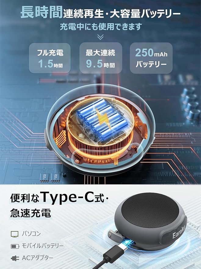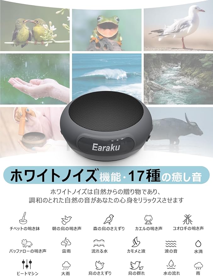 ❤【ホワイトノイズ機能・豊かなパッケージ内容】このEaraku (イアラク) Bluetoothスピーカーは、睡眠補助のためのホワイトノイズ機能が搭載されており、17種類のホワイトノイズメロディが内蔵されています。ホワイトノイズは自然からの贈り物であり、いつでもどこでもリラックスできる環境を作り上げ、騒がしい環境の干渉から遠ざかり、ひとときの静寂と平穏を楽しむことができます。パッケージ内容:スピーカー本体*1、ウェアラブル腕バンド*1、フックなしのクリップ*1、フック付きのクリップ*1、充電ケーブル*1、取扱説明書*1。