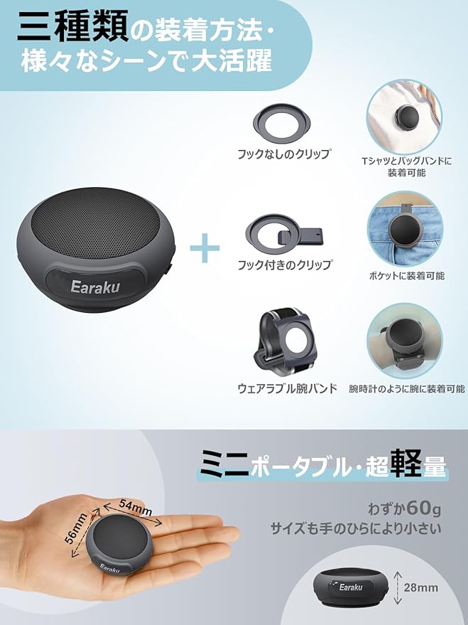 【3WAY装着・雨でも汗でもOK!】 Earaku (イアラク) Bluetoothスピーカー 60g超軽量ミニ ワイヤレス IPX-6防水 ポータブル ブルートゥーススピーカー ステレオ 装着可能/マイク内蔵/Type-C充電/TWS対応/ハンズフリー通話 2台ペアリング アウトドア お風呂 キャンプ おしゃれ プレゼント
