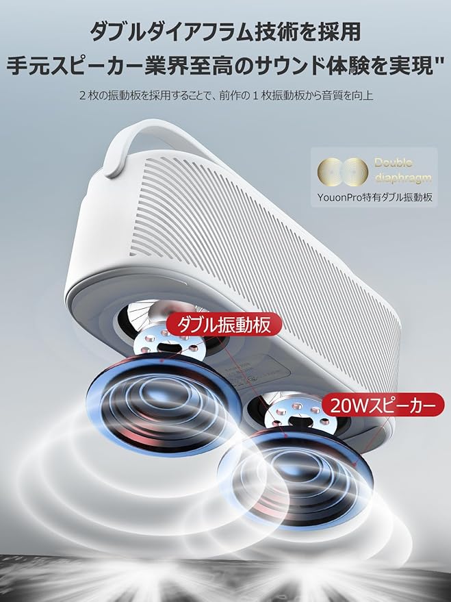 【手元スピーカー業界初・20W強力サウンド波】「優音」Youon Pro手元スピーカー業界初となる最大20Wの強力サウンド波を搭載し、圧倒的な音量と迫力で音楽や効果音を余すことなく再生します。部屋の隅々にまでクリアで豊かな音が行き渡り、まるでその場にいるかのような臨場感溢れるサウンドスペースを創造します。音の深みと迫力を感じながら、全身で音楽や映像を楽しむことができる、次世代の音響体験を提供します。