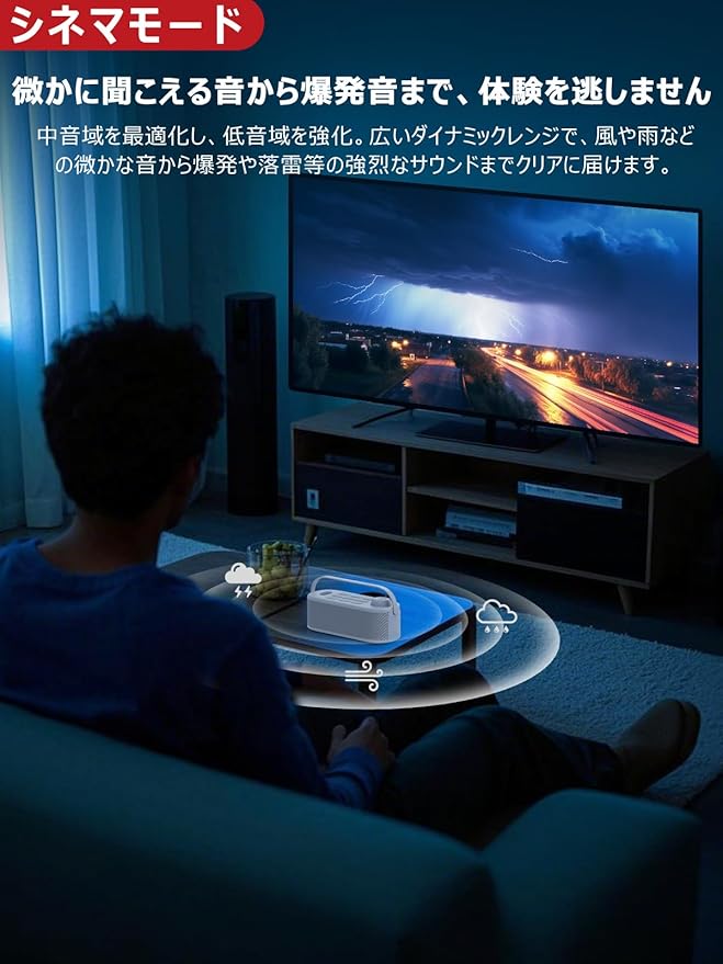 【3つの極上音質モード】「優音」Youon Proはテレビモード、音楽モード、シネマモードが用意されています。視聴内容に応じてモードを切り替えることで、最適な音質を楽しむことができます。「テレビモード」では、番組の会話をはっきりと聴き取りやすく、「音楽モード」では音楽のニュアンスを存分に味わい、「シネマモード」では映画館のような臨場感あるサウンドを楽しむことができます。