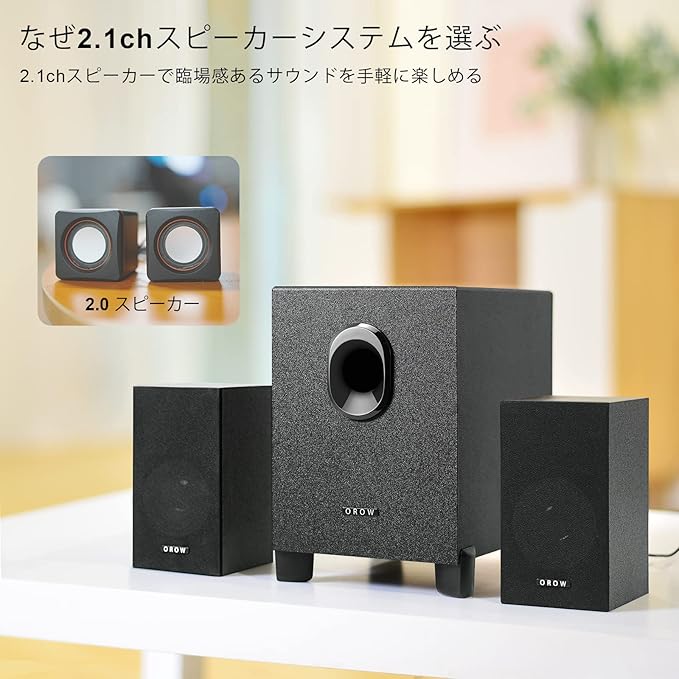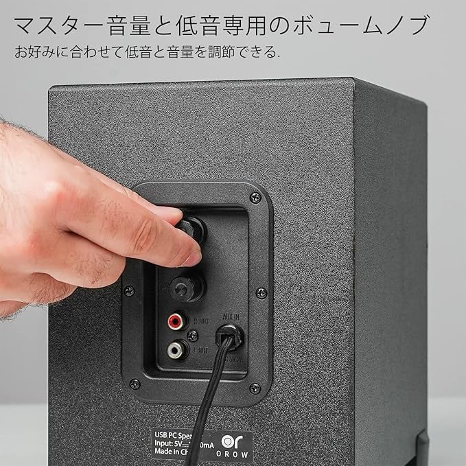 OROW PCスピーカー パソコン用 ステレオ 2.1ch サブウーファー 16W出力 usb スピーカー 重低音 スマホ テレビスピーカー ゲーミングスピーカー 3.5mm入力対応 木製 ブラック