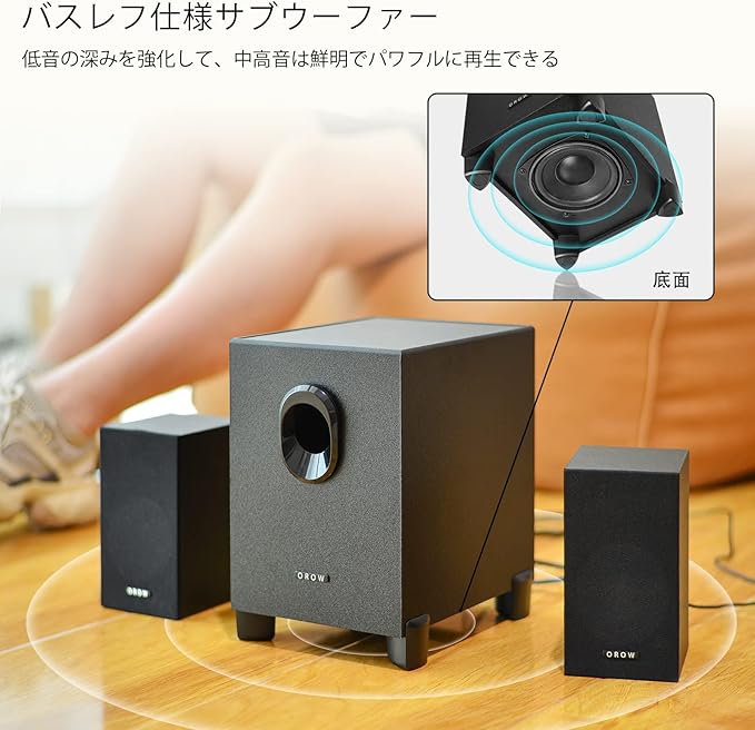 【専用の音量と低音調節ボタン】専用のコントロールノブを使って、お好みに合わせて低音と適切な音量を調節できます。迫力の重低音を再現できる直径106mmのサブウーファーユニットを搭載。また、バスレフ仕様により、パワフルなサウンドと深みのある低音を再現し、あらゆるPCエンターテインメントを堪能できます。