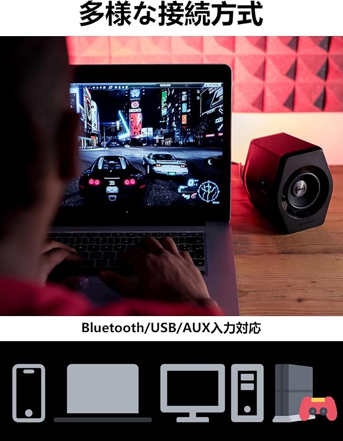 【フルカラーRGBライト】当社のゲーミングスピーカーには、12色を自由に切り替えられる美しいRGBライトが搭載されています.暗いところではさらにカッコよく見えます.より魅力的なゲーム/音楽/映画の雰囲気をお楽しみます。