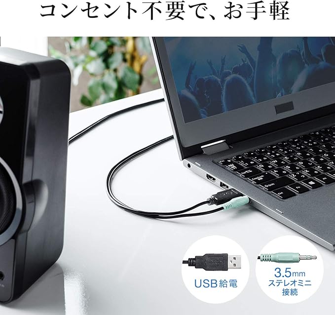 USB ポートから電源を供給するUSB給電方式のスピーカーです。AC電源を必要としないのですっきりと配線でき、簡単に設置できます。