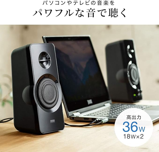 サンワダイレクト PC スピーカー 高出力36W USB電源 3.5mmステレオミニジャック接続 ヘッドホン対応 低音調整 1個 400-SP082