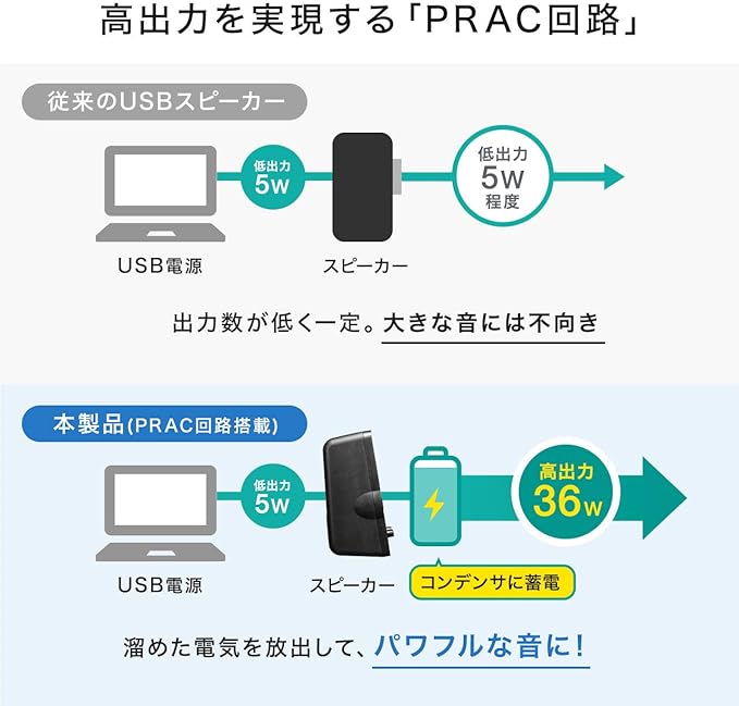 従来のUSB電源スピーカーでは出力することができない高出力を実現するため、内部に大型コンデンサを搭載しています。