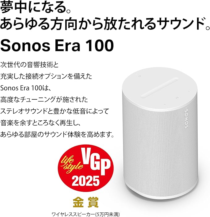 Sonos Era 100 ※価格改定【VGP2025 ワイヤレススピーカー(5万円未満)部門 金賞】 スマートスピーカー サラウンドリヤスピーカー ステレオペア対応 bluetooth5.0 ポータブルスピーカー ワイヤレス アプリ対応 内蔵マイク搭載 アイコンサウンド WiFi Apple Air Play 2 アンプ/ツイーター/ウーファー ホワイト