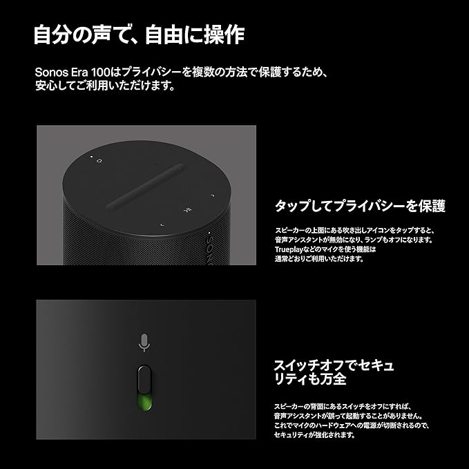 遠距離対応マイクロホンアレイが高度なビームフォーミング技術とマルチチャンネル時のエコーキャンセリング技術を駆使し、迅速で正確な音声コントロールとTrueplayチューニングを可能にします。マイク機能を使用したくない場合、トグルスイッチでオフ操作が可能です。