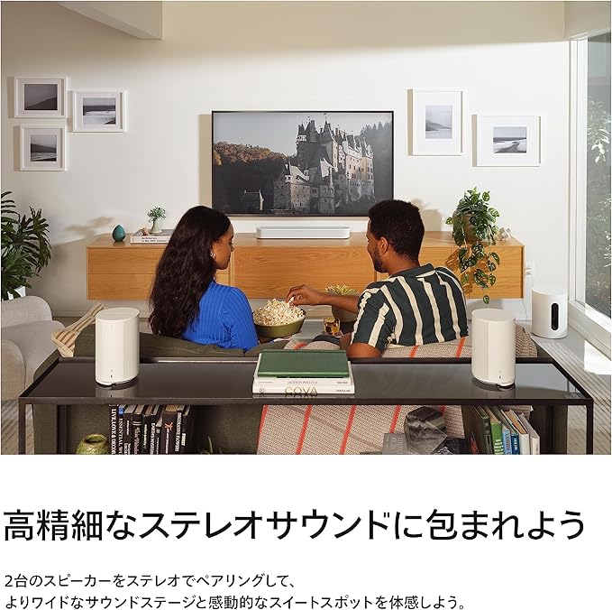 【システムを自在に拡張】2台のSonosEra100をリアスピーカーとしてSonosのサウンドバーに加えると本格的なサラウンドサウンドシステムを構築でき、映画体験がさらにレベルアップします。2台をペアリングすれば、お部屋中を満たすステレオサウンドを楽しめます。