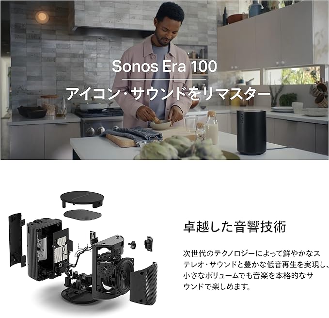 ベストセラーのSonosOneを改良に改良を重ねリマスターした、SonosEra100。最新のハード&ソフトウェアを搭載したスマートスピーカーは、新世代の音響とデザインで繊細高精細なステレオ・サウンド、そして深みのある低音を響かせます。