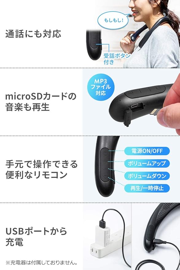 音楽が入ったmicroSDカードを装着すれば、そのまま音楽プレーヤーとしても使用できる ウェアラブルネックスピーカー です。