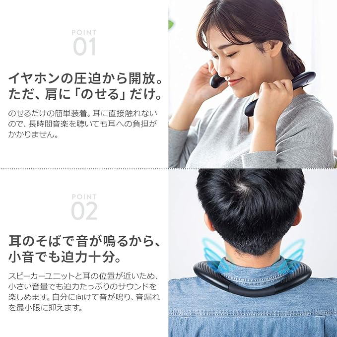 首・肩にのせるタイプの 首掛けスピーカー です。肩に乗せるだけで耳を塞がないから、開放感のあるスタイルで音を楽しめます。音に包まれるような感覚が臨場感のある新しいリスニング体験を実現します。