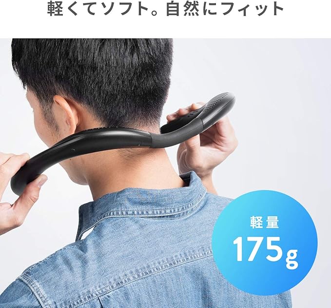 装着のしやすさ、首元への負担を軽減するため軟らかいシリコン製のネック部を採用しています。装着しやすいので、動きまわりながら使用でき、家事をしながらや自転車での使用などが可能です。重量はわずか175gで長時間の装着でも快適にご使用いただけます。
